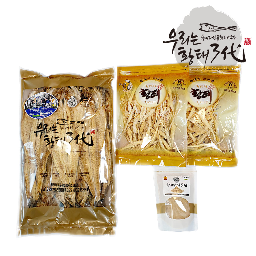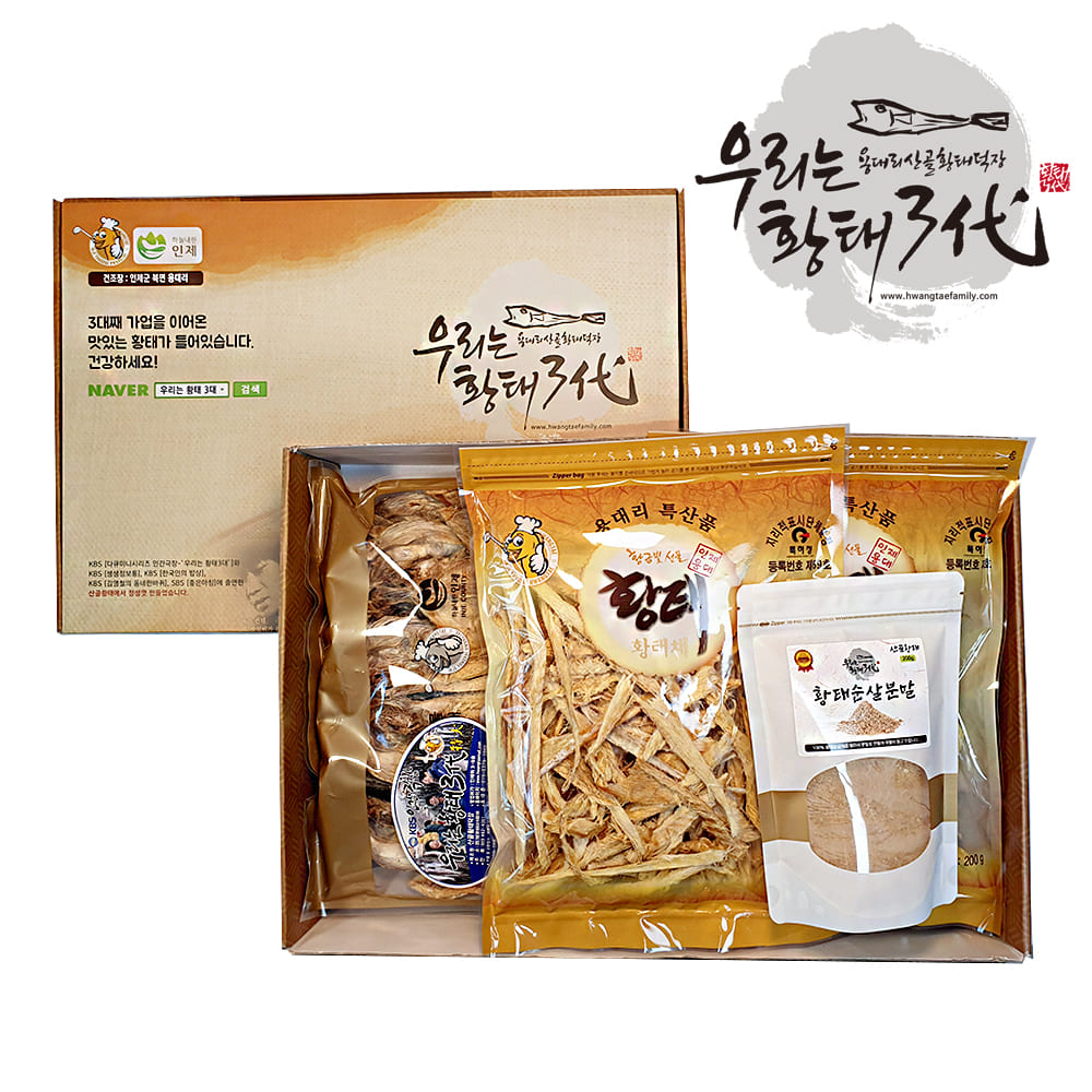 - 용대리 산골황태덕장에서 우리는 황태 3대가 자연건조한 제품으로, 선물용으로 신뢰도도 높습니다.